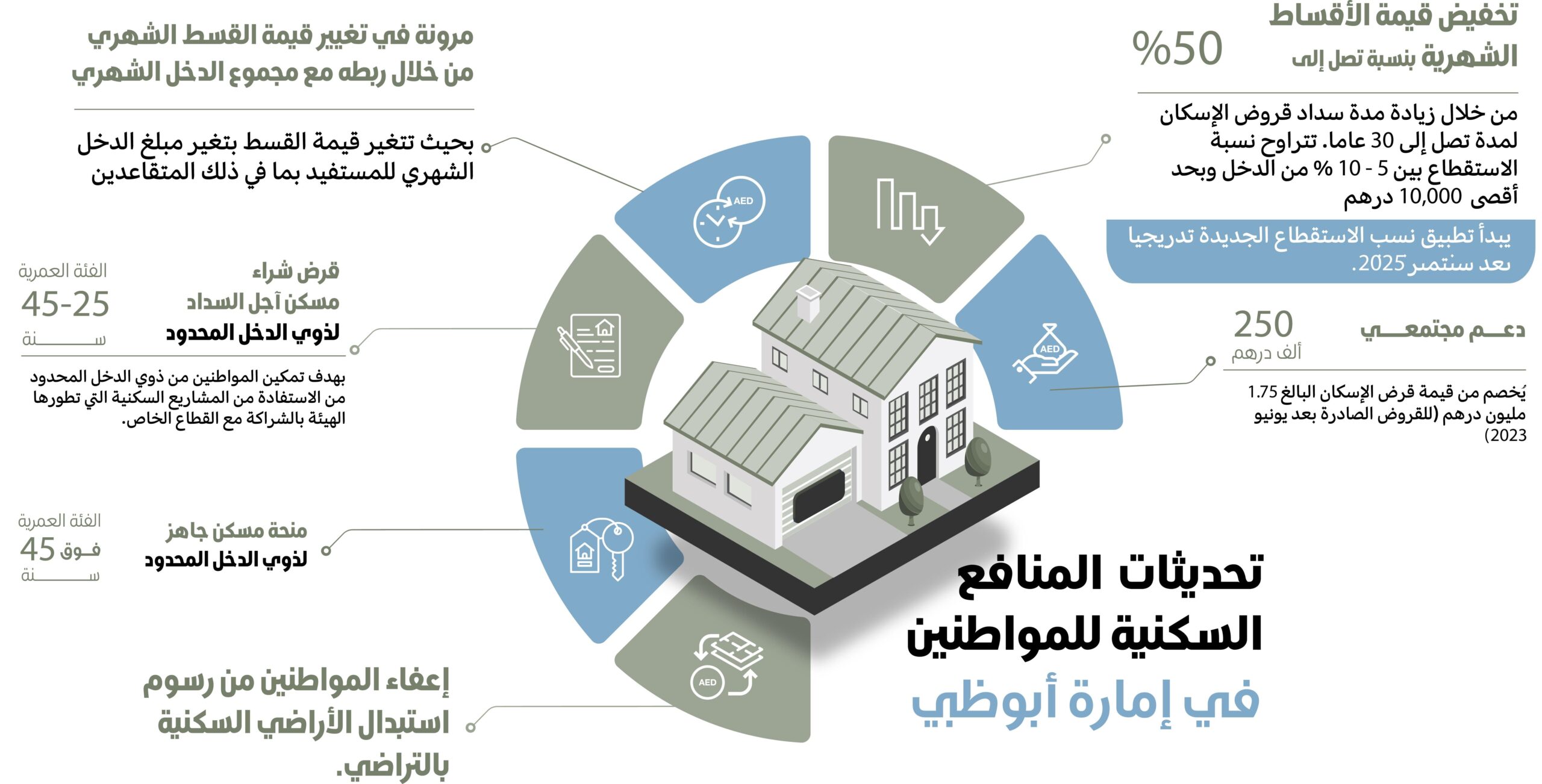 اعتمدت أبوظبي تنفيذ 14 مشروعاً سكنياً جديداً تضم 35 ألف منفعة سكنية، إلى جانب تسهيلات واسعة في القروض دعماً لاستقرار المواطنين.